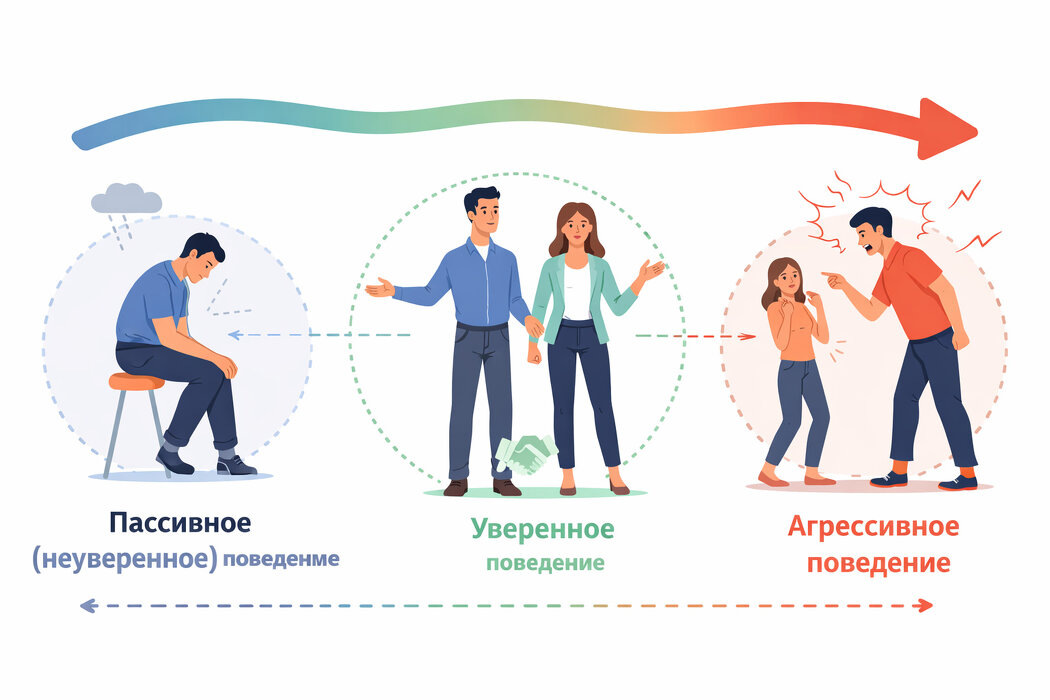 Ассертивность представляет собой умение открыто и честно выражать свои мысли, чувства и потребности, при этом уважая границы других людей. Если визуализировать подобное поведение, можно представить его как шкалу: