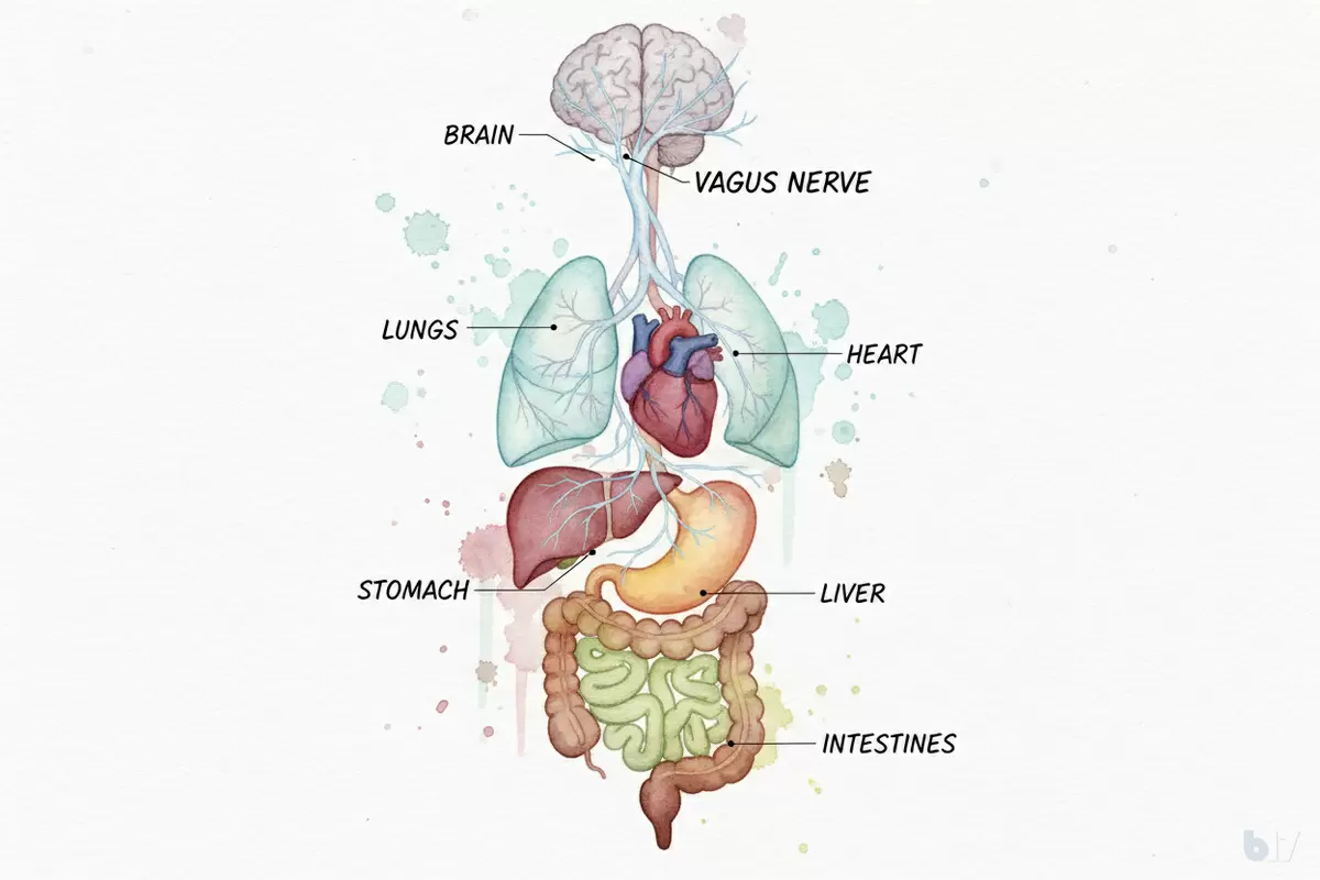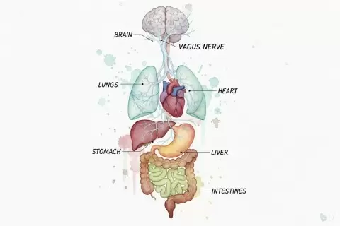 Основная роль в этом процессе принадлежит блуждающему нерву, который простирается от мозга до кишечника. Он не просто присутствует в организме, а управляет такими функциями, как сердцебиение, дыхание, пищеварение и даже ваши эмоции.