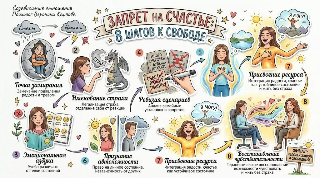 Чтобы преодолеть страх радости, предлагается пройти маркерные этапы: