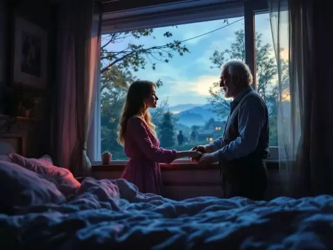 Видение, где молодая женщина общается с пожилым мужчиной у окна деревенского дома, может быть символичным и многозначным. Снаружи на фоне зелёных деревьев и старинных зданий разворачивается интересный сюжет: женщина, держа мужчину за руку, ищет связь с ушедшими корнями.
